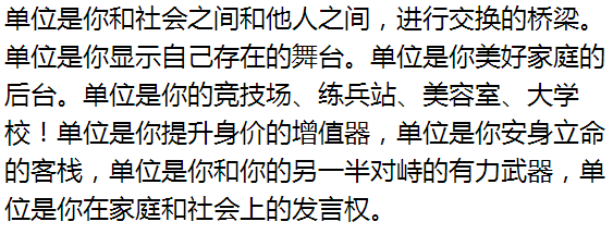 你不种地,但你有吃有喝;你不织布,但你衣着华丽;你不造车,但你以车代步;你不盖楼,但你家居安泰,你不是神仙,但许多人尊重你;你没有才华,但你仍然能够参与社会;你相貌平平,但你的爱人喜欢你;你能力一般,但你的儿女崇拜你。这是为什么呢?你是依靠什么去和他们进行交换?你是依靠什么获得你需要的生活物品?你是依靠什么赢得社会的尊重?答案就是单位。</span>