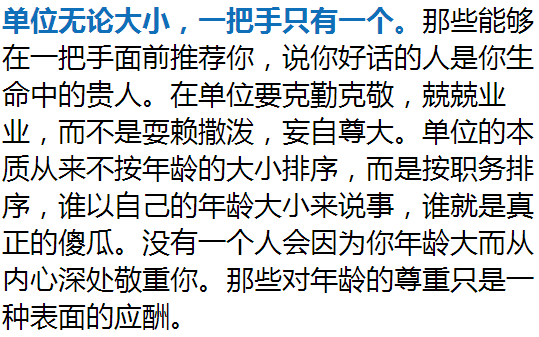 在单位老年人有老年人的优势,年轻人有年轻人的优势。万万不可互相轻视,那是自相残杀。</span>在单位能多干一点就多干一点,总有人会记得你的好。在单位千万不可以带一个不好的头,不要破坏单位的规则。那样就是拆一把手的台,也就是拆自己的台。一定要把属于私人的事限制在私人的空间。否则,关键时刻没有人认可你。在单位要尽量远离那些鼓动你不工作的人,鼓动你闹矛盾的人,那是在让你吸毒品。</span>